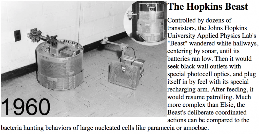 The Johns Hopkins robotics research dates to the early 1960s when researchers at the Johns Hopkins University Applied Physics Laboratory (JHU APL) developed the Johns Hopkins Beast, a wheeled mobile robot that reportedly could navigate hallways and automatically locate and connect to wall outlets to autonomously recharge its batteries. Robotics research at the Whiting School of Engineering (WSE) began in the mid-1990s with the arrival of Gregory Chirikjian in 1992, and of Louis Whitcomb and Russell Taylor in 1995. Subsequently, the establishment of the NSF Engineering Research Center for Computer-Integrated Surgical Systems and Technology (CISST ERC) in 1998 led to a significant expansion of the robotics program, with a strong emphasis on medical robotics.